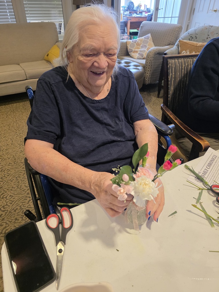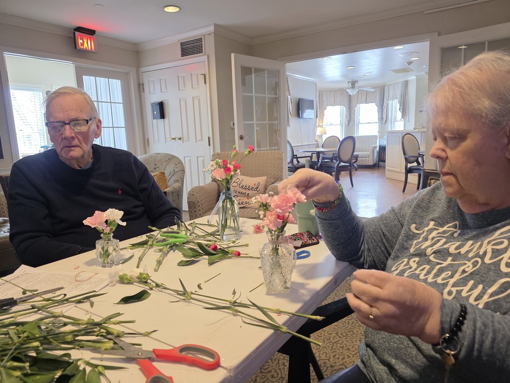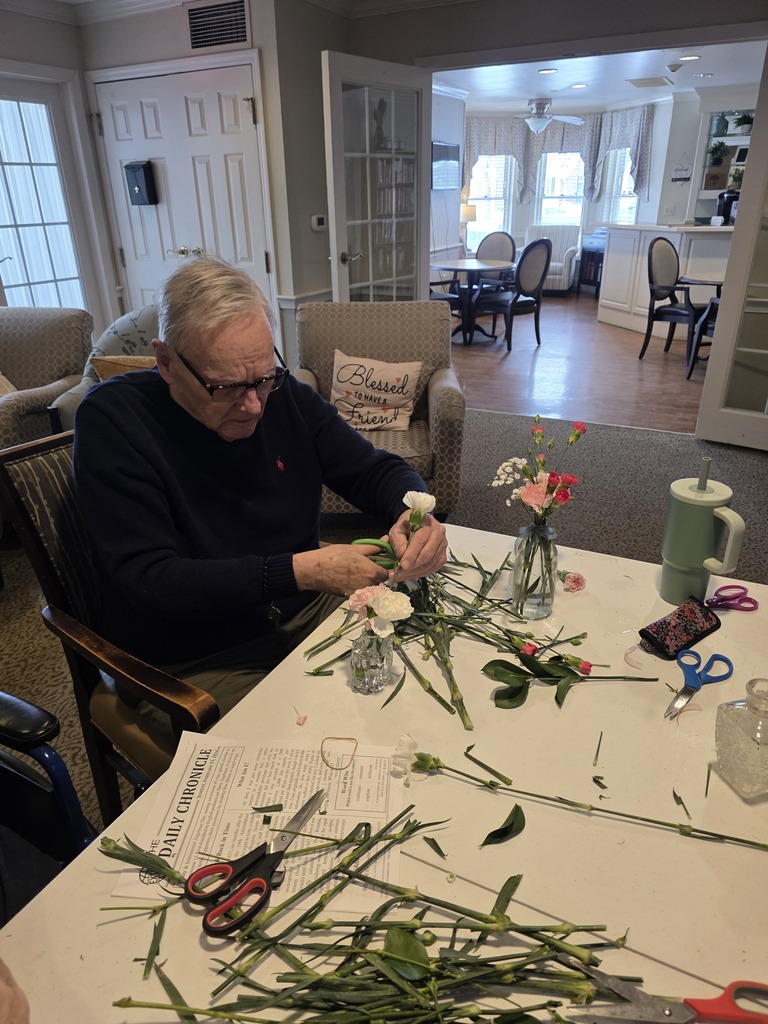 Montessori-based dementia care is a person-centered approach that emphasizes recognizing individual strengths and preferences through structured, familiar tasks. At Bickford of Bexley Assisted Living and Memory Care, activities such as flower arranging for all the dining room tables help residents feel useful and connected, all while having fun at the same time! #montessoridemeniacare #seniorlivingpurpose #assistedlivinglife