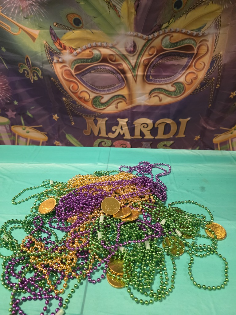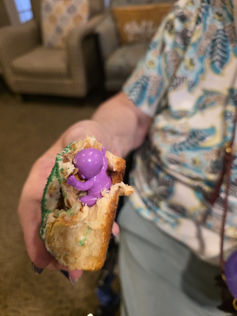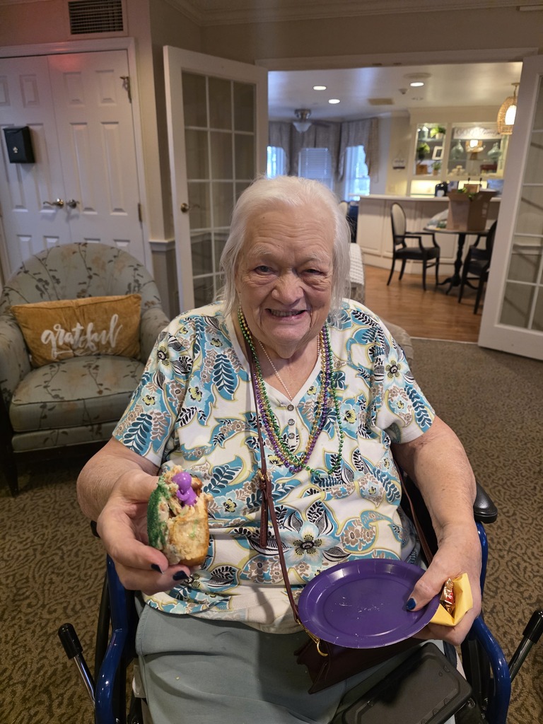 Mark your calendar for Mardi Gras 2027! Because Ms. Mary will be hosting the next year's party at Bickford of Bexley Assisted Living and Memory Care since she found the baby in the king cake! (It's tradition!)