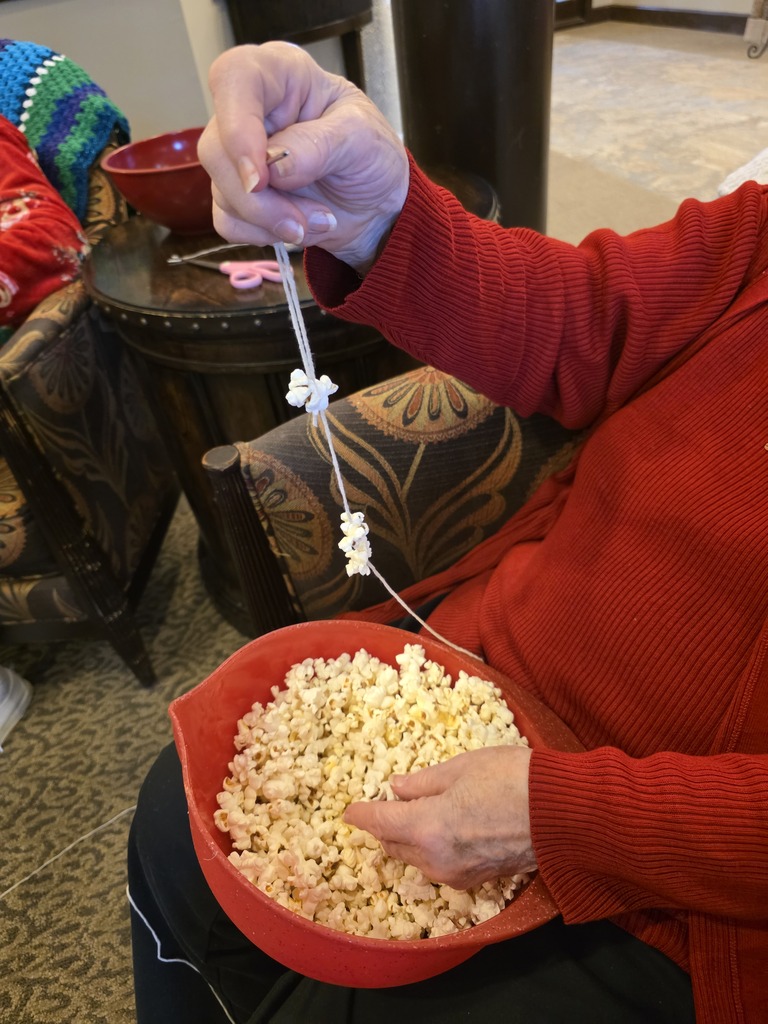 Popcorn Garland for the 11 out of 12 days of Christmas, Nicole singing christmas songs and lifting our spirits up for the holiday here at Bickford of Greenwood Assisted Living and Montessori Memory Care! #CARD #Montessori #MemoryCare #HigherPath