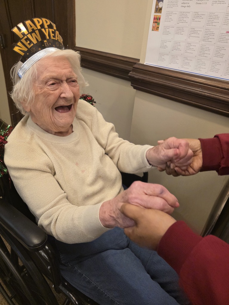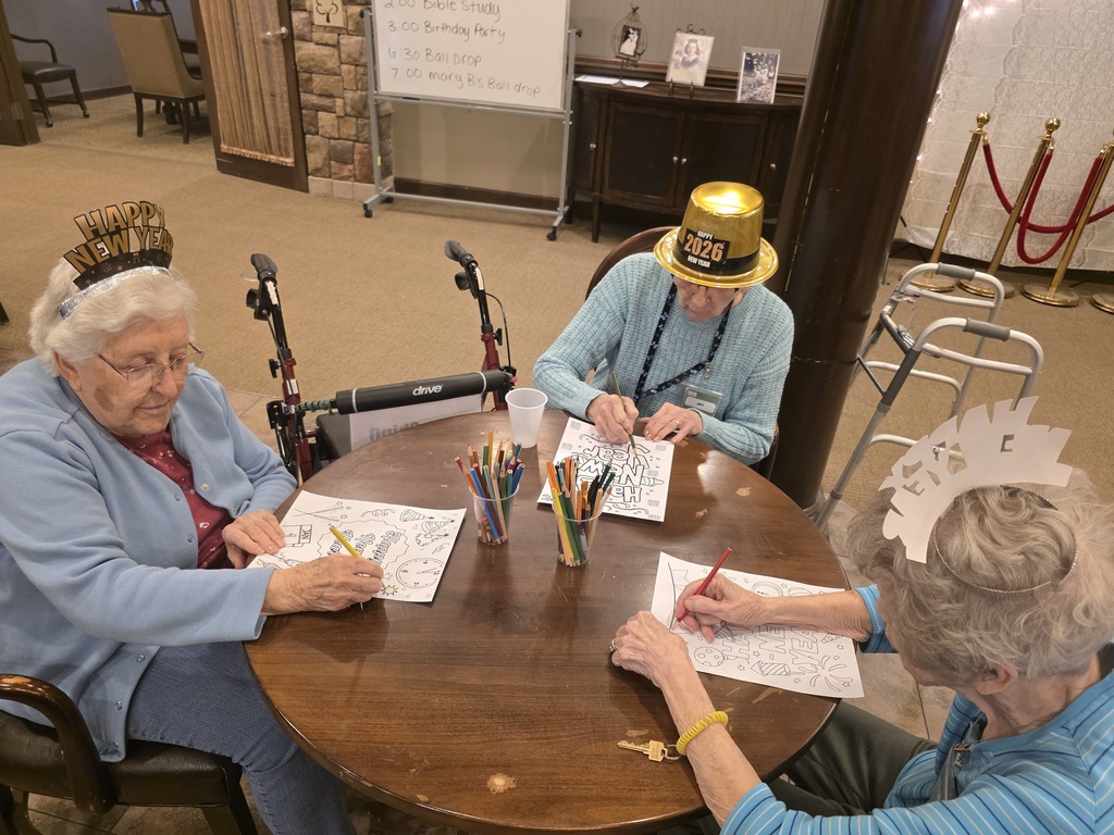 New Year engagement included cooking club, music therapy, dancing, game of uno with friends, little competition of coloring contest with a prize, fox therapy session, birthday month celebration here at Bickford of Greenwood Assisted Living and Montessori Memory Care. #card #Montessori #HigherPath #memorycare