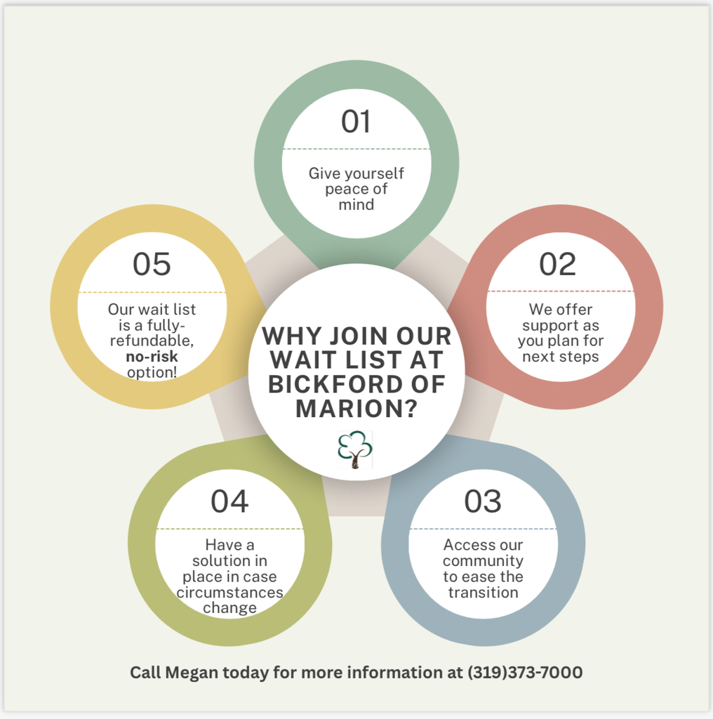 As we approach the cold and flu season, snowy weather, and all of the challenges that come with them, take a moment to think about your loved one living at home and how they would respond to these challenges. Joining our wait list can provide peace of mind and a plan in case something changes. We all hope that doesn’t happen, but wouldn’t it be better to be prepared? Our HigherPath is all about being proactive, and this is one way to have a plan in place before you need it. Call Megan at (319)373-7000 for more information on our wait list, or to schedule a tour. #BickfordOfMarion #HigherPath