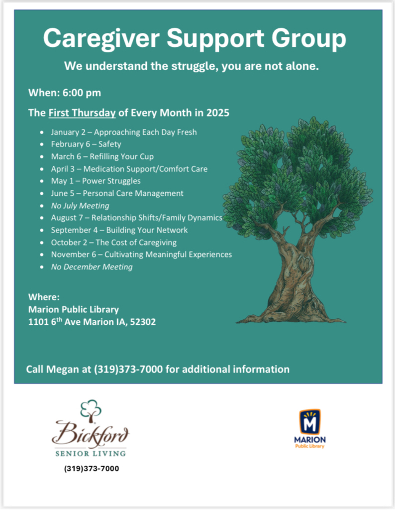 This Thursday is the final Caregiver Support Group meeting of 2025. We will be meeting at the Marion Public Library at 6 pm, come check it out! This group is such a great way to connect with others in a similar situation, or they have been where you are, and may be able to offer a new perspective. This resource is free and open to the public. We look forward to seeing you there! For more information, please call Megan at (319)373-7000. #BickfordOfMarion #WhateverItTakes