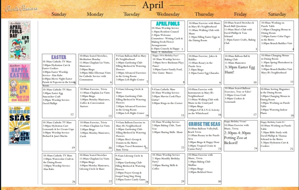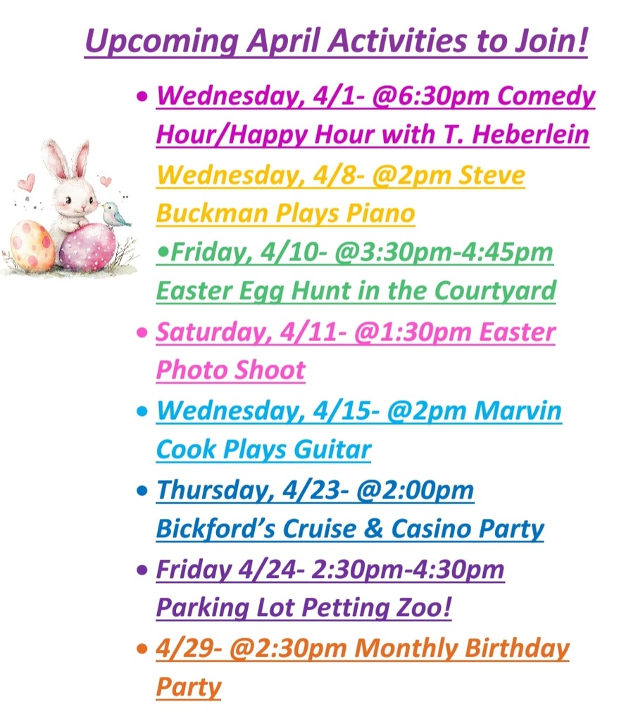 The staff are great!! Would appreciate activities in the evening after dinner as my mom doesn't go to bed until 11. Would like to see bingo or something from 7-8 or so at night.