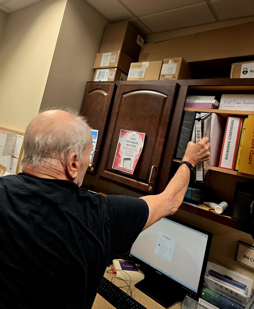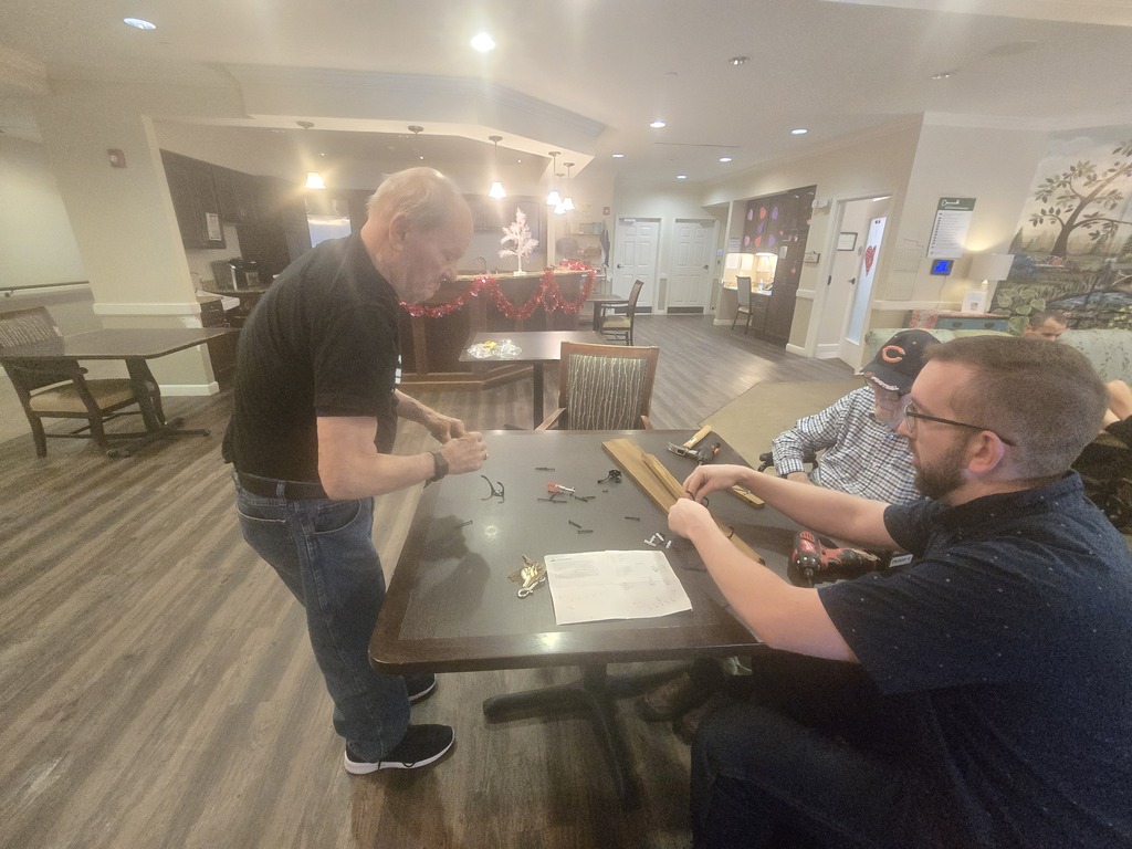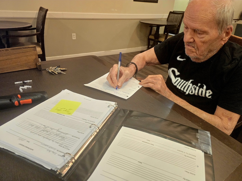 The Maintenance Crew Is At It Again! The day started with a quick check at the official agenda. David grabbed the Maintenance log from the front office to see what was on the schedule, and the mission was clear. Assisted Living needed a new name tag station. Earl and Matt did not waste any time. After signing their " Action Plan" to take ownership of the job, the crew set up shop in Mary B's. It was a full-on team effort, with the guys diving into the directions and hardware to make sure everything was up to spec. Earl took the lead on the power drill to secure the hooks, while Matt handled the precision work, prepping the wood frame and checking the instructions. By the time they were done, they transformed a pile of wooden parts into a beautiful hand crafted station. The finished name tag rack is officially mounted and ready for action.