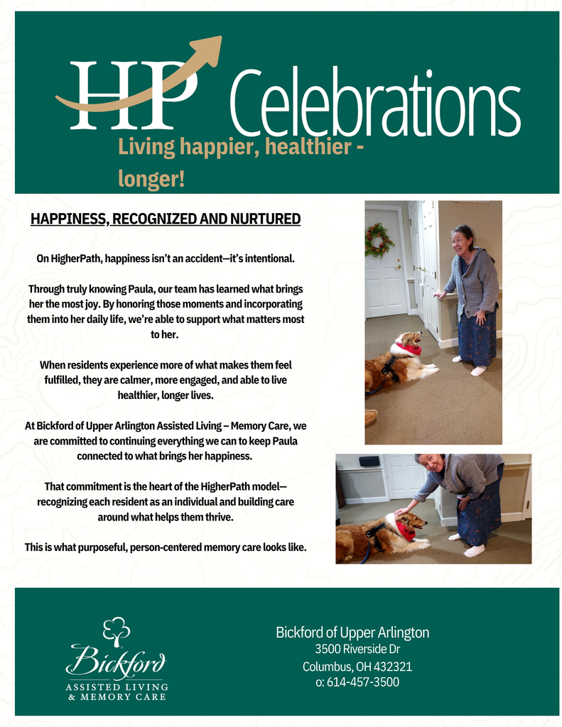 A meaningful, happy and healthy life is prioritized for our residents here at Bickford of Upper Arlington Assisted Living and Memory Care… If you would like to know more about our HigherPath healthcare model and how your loved one could benefit from it, stop by for a tour! #HigherPath #SeniorLiving #AssistedLiving #MemoryCare #BickfordOfUpperArlington
