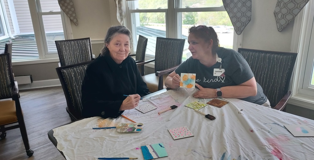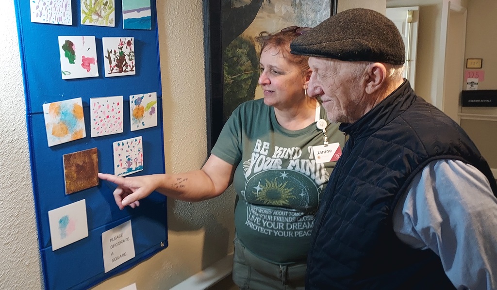 Jack and I are admiring all the beautiful artwork created here on Mary B’s at Bickford Assisted Living Memory Care. So much creativity and talent shines through each piece! #paintingwithfriends