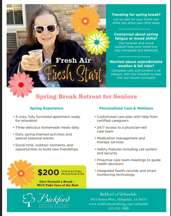 If you or a loved one could use a little extra support, our Spring Respite Special is here to help. Whether you need short-term care after a hospital stay, a safe place while caregivers travel, or just a refreshing change of pace, Bickford of Urbandale offers comfort, care, and peace of mind.